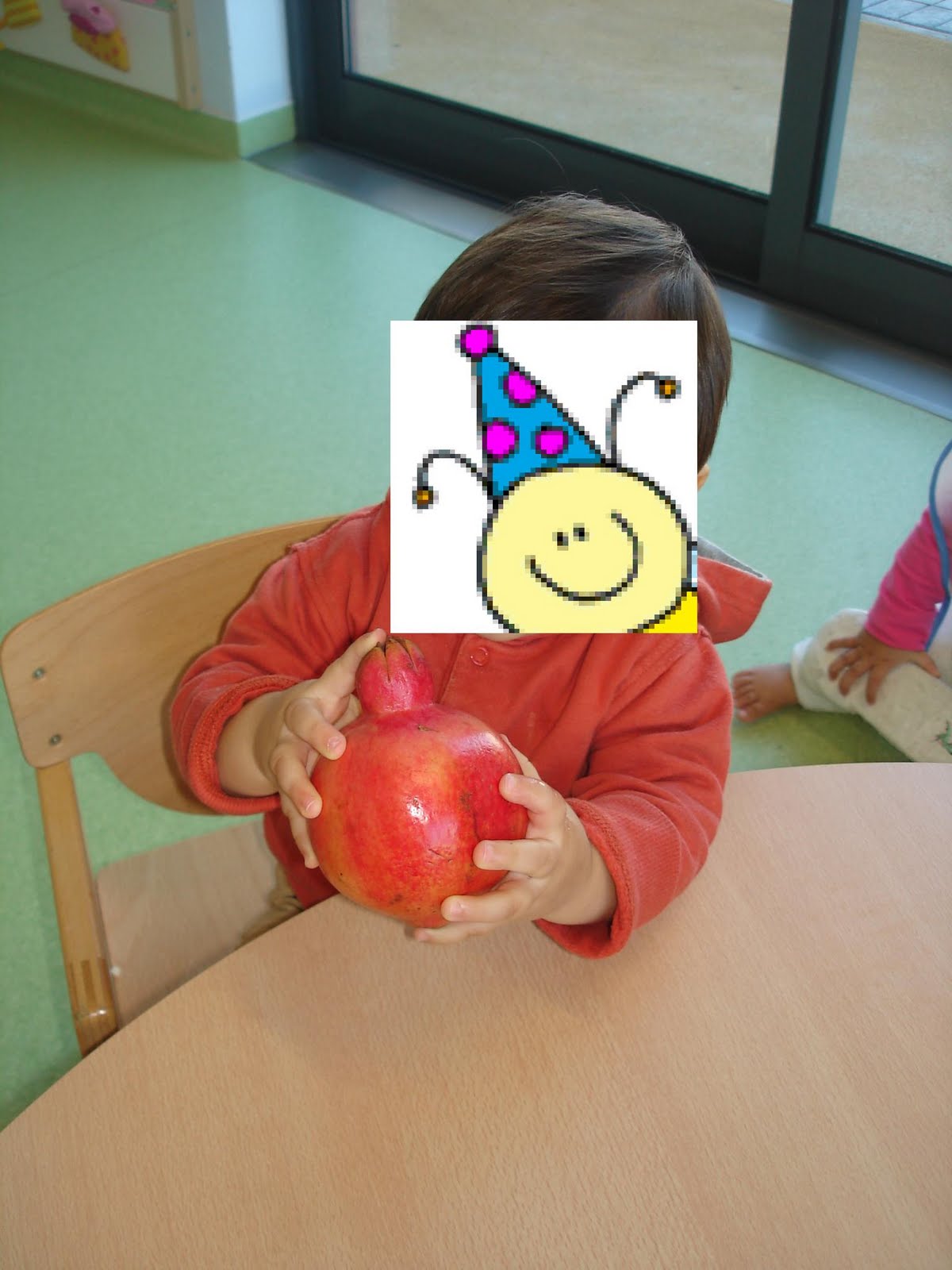 Para "estudarmos" a romã tocámos e sentimos como era bem redondinha e lisa, vimos a sua cor, cheirámos (Hummmm tão bom!) e pintámos uma metade para carimbarmos com ela :)