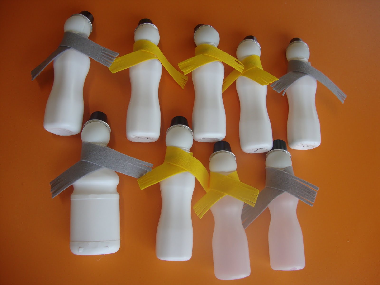 Bonecos de neve feitos com embalagens de iogurte, cápsulas de café, pauzinhos de madeira e feltro. Há exepção do tecido, foi tudo feito reaproveitando materiais! :)