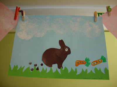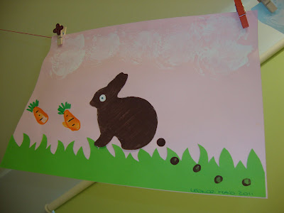 Primeiro pintámos os coelhos com um molde e uma esponja, depois fizémos os "cocós" e o olho, e no final as cenouras com o dedo.