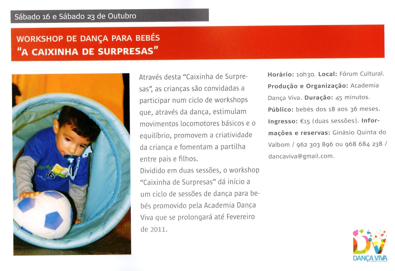 Dividido em duas sessões, o workshop "Caixinha de Surpresas" dá início a um ciclo de sessões de dança para bebés promovido pela Academia Dança Viva que se prolongará até Fevereiro de 2011."