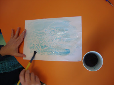 Este desenho consiste em desenhar numa folha branca com uma vela de cor branca também. Depois passámos por cima com um pincel onde tínhamos colocado papel crepe azul com água. Pincelámos na folha branca e apareceu o que as Abelhinhas tinham desenhado com a vela.