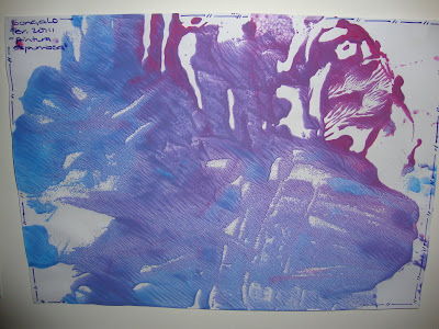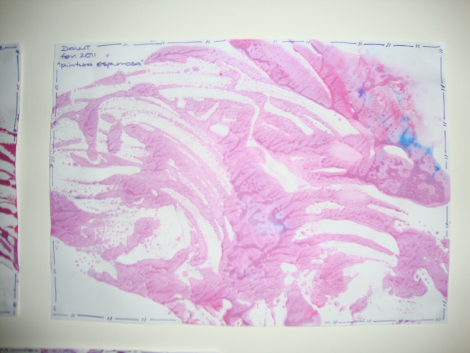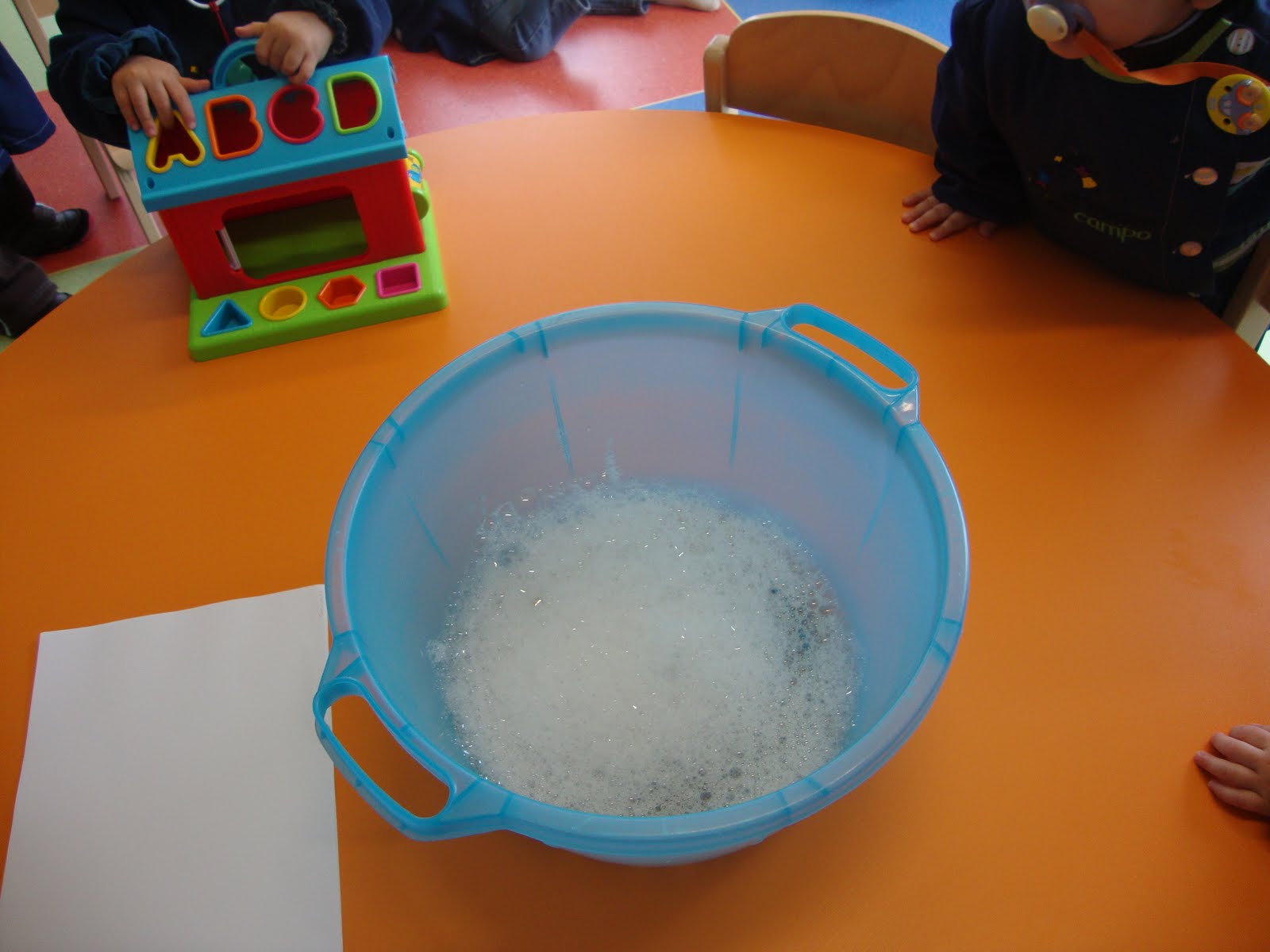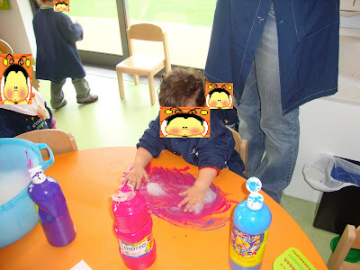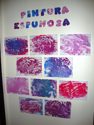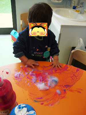 Espalhámos tinta na mesa e juntámos espuma que já estava preparada no alguidar...