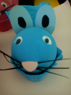 Ainda durante a semana passada as Abelhinhas realizaram a lembrança da Páscoa para dar aos papás. Esta prendinha foi feita com caixas de ovos, bolas de ping pong e cartolina.
